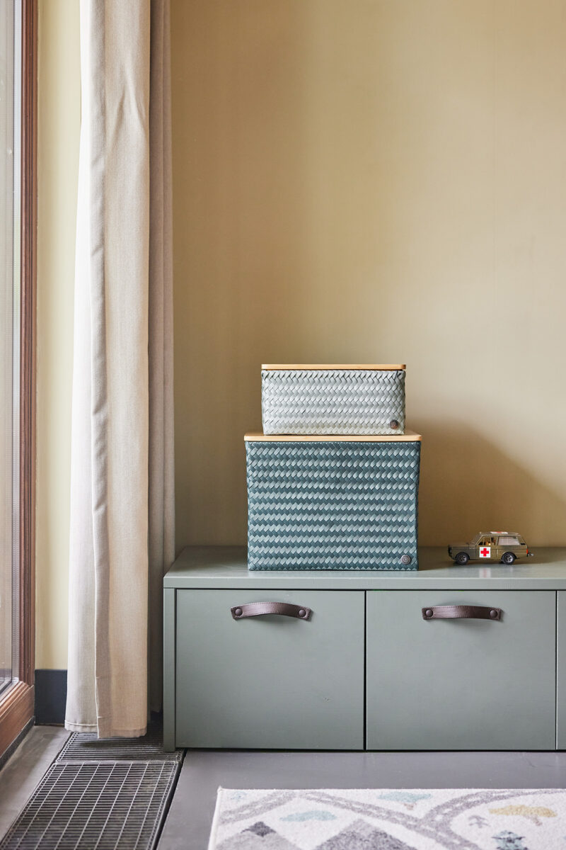 Les paniers sont tressés avec une sangle extra-fine, ce qui crée un joli motif en blocs subtil. Disponibles en couleurs unies apaisantes ou en douces combinaisons de couleurs, qui mettent parfaitement en valeur le travail de tressage.
