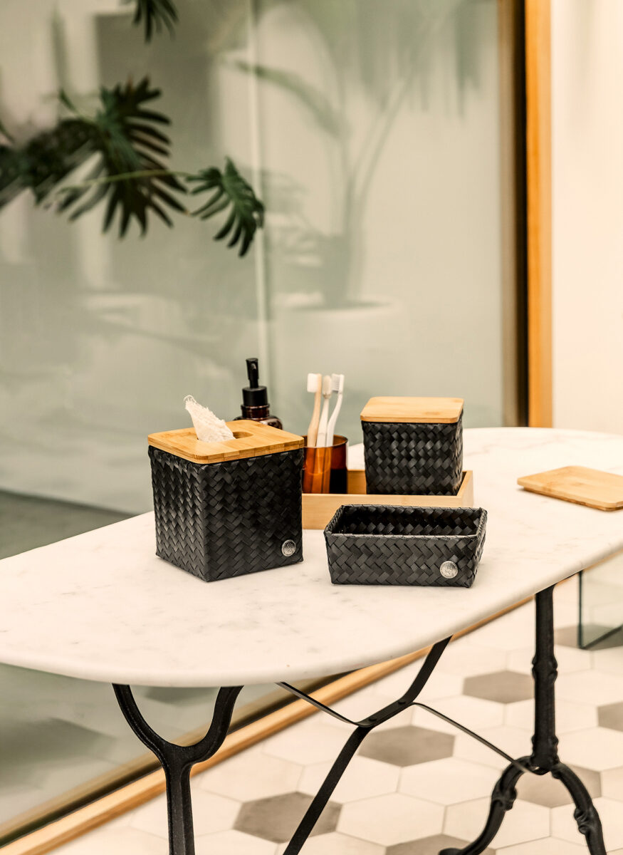 La plupart des boîtes à mouchoirs en papier que vous achetez ont d’un design qui ne s’accorde pas à votre intérieur. Nous avons développé 2 différentes formes de paniers dotés d’un couvercle en bambou qui vous permet d’utiliser votre boîte à mouchoirs de façon élégante. Rectangulaires ou carrées, dans des couleurs d’intérieur à la mode ; l’une d’elles s’adaptera sans aucun doute à votre intérieur ! Les paniers Top Fit avec couvercle en bambou solide constituent également une solution de rangement multifonctionnelle et décorative pour n’importe quelle pièce. La structure tissée à la main associée à la sélection de couleurs ajoute de la texture et de la chaleur à votre intérieur. Utilisez-les en combinaison avec d’autres paniers ou tout simplement seuls dans votre salle de bains, votre cuisine ou votre salon. Fabriquées en plastique recyclé, faciles à nettoyer.