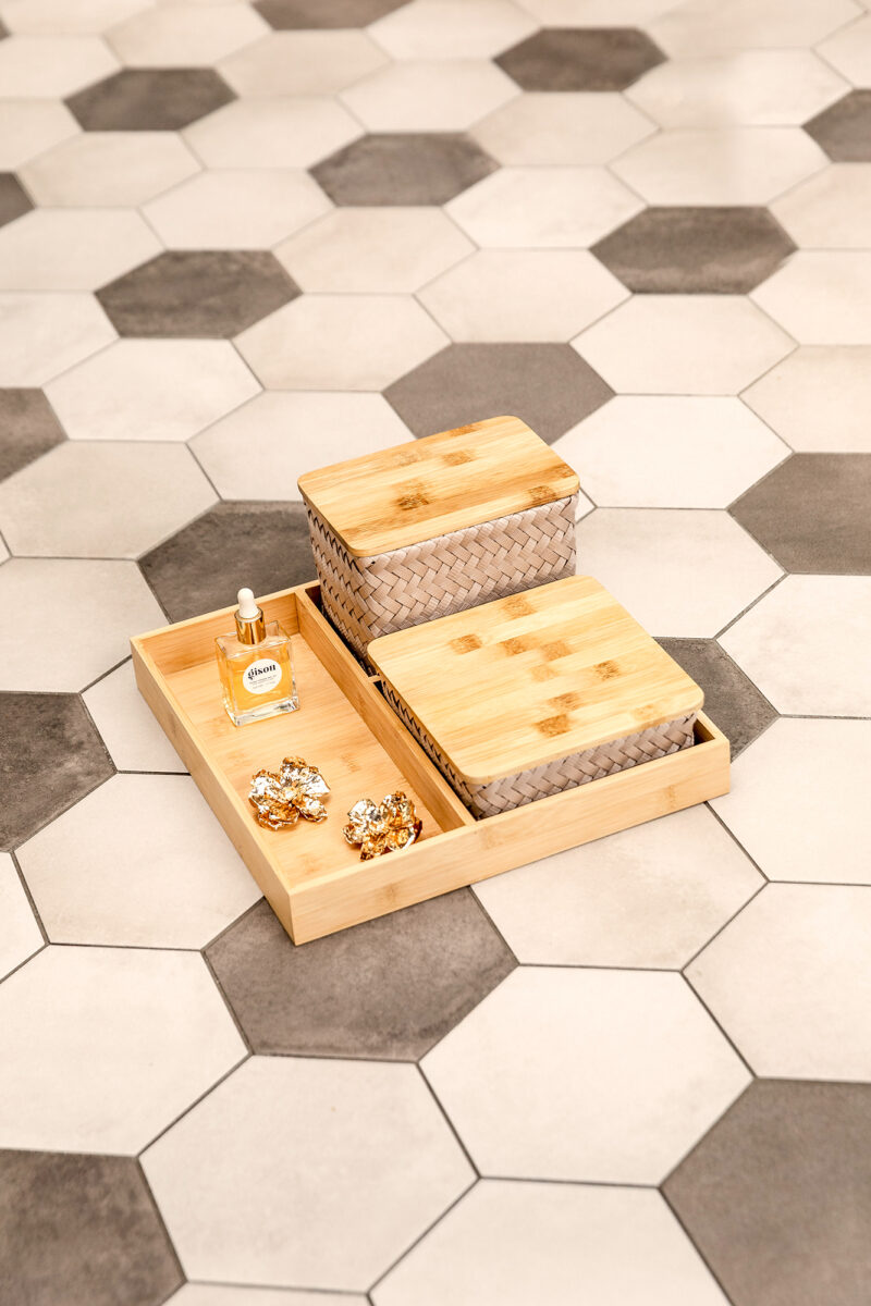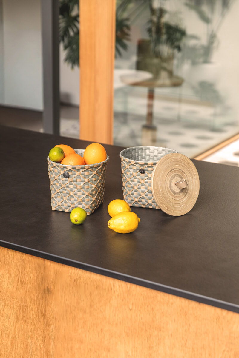 Mettez de l’ordre dans le chaos avec notre ORGANIZE (F)IT! Cet élégant plateau en bambou est accompagné de deux paniers tressés à la main avec couvercles. Idéal pour ranger le coton et les accessoires dans la salle de bain, ou pour garder votre espace de travail organisé et tendance. Disponible en différentes couleurs. Les paniers sont fabriqués à partir de plastique recyclé et peuvent être facilement fermés à l’aide de couvercles en bambou.